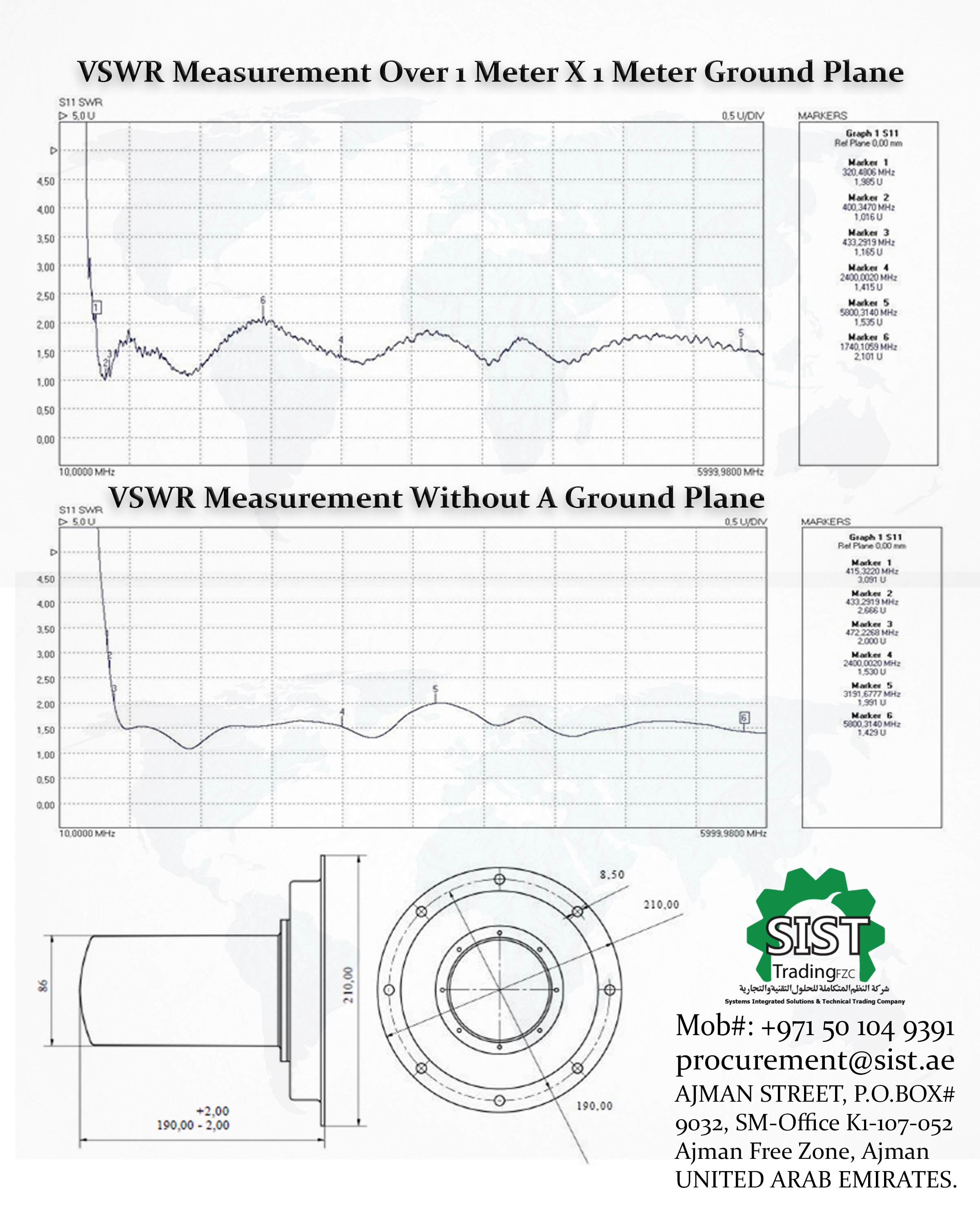 Over 1X1 m2Ground Plane: 330-6000 MHz ≤ 2.5:1 Without a Ground Plane 420-6000 MHz ≤ 3.0:1 475-6000 MHz ≤ 2.5:1 |